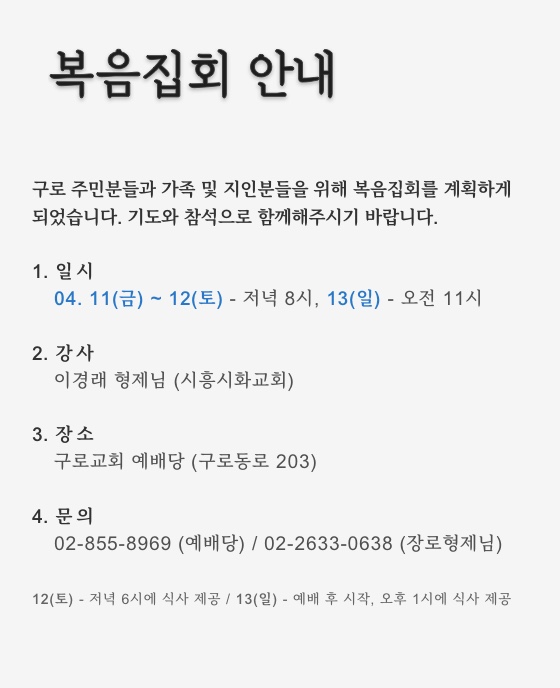 | 1460 | [복음] 서김해교회 11월15일(금)~17일(일) | 최영준 | 2024.11.08 | 230 |
